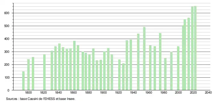 - ↑ Population municipale de référence en vigueur au 1er janvier 2025, millésimée 2022, définie dans les limites territoriales en vigueur au 1er janvier 2024, date de référence statistique : 1er janvier 2022.