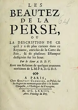 - ↑ DAULIER DESLANDES, André. Les Beautez de la Perse, ou la Description de ce qu'il y a de plus curieux dans ce Royaume, enrichie de la Carte du Païs, & de plufieurs Eftampes deffignées fur les lieux. Avec une Relation de quelques avantures maritimes de L.M.P.R.D.G.D.F., Paris, Gervais Clouzier, 1673, 133 p.