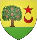 D'or au noyer au naturel, terrassé de sinople, senestré d'une étoile de gueules soutenu d'un croissant du même[4].