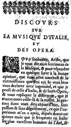 - Texte repris avec des changements dans Pierre de Saint-Glas, éd. Divers traitez d'histoire, de morale et d'éloquence... VI. Discours de la musique d'Italie et des Opéras. Paris : Vve C. Thiboust et E. Esclassan, 1672. 12°, [8]-179 p. Numérisé sur Gallica.