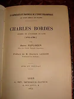 - ↑ Gustave Reynier, « ANDRE RUPLINGER. Un représentant provincial de l'esprit philosophique au XVIIIe siècle en France: Charles Bordes, membre de l'Académie de Lyon (1711-1781) », dans Société d'histoire littéraire de la France, Revue d'histoire littéraire de la France, Armand Colin, (lire en ligne), p. 620