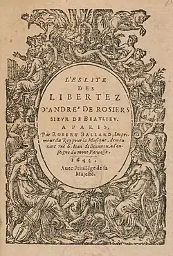 - L’Eslite des libertez d’André de Rosiers sieur de Beaulieu. Paris : Robert III Ballard, 1643 ou 1644. 8°, RISM R 2633 et 2634, Guillo 2003 no 1643-G, sur Gallica.