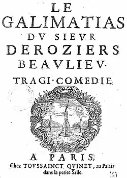 - Le Galimatias du sieur Deroziers Beaulieu. Tragi-comédie. Paris : Toussaint Quinet, 1639. 4°, 97 p.