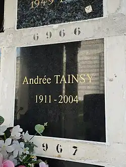 - 1 2 Insee, « Extrait de l’acte de décès d’Andrée Micheline Ghislaine Tainsy », sur MatchID.io (consulté le )