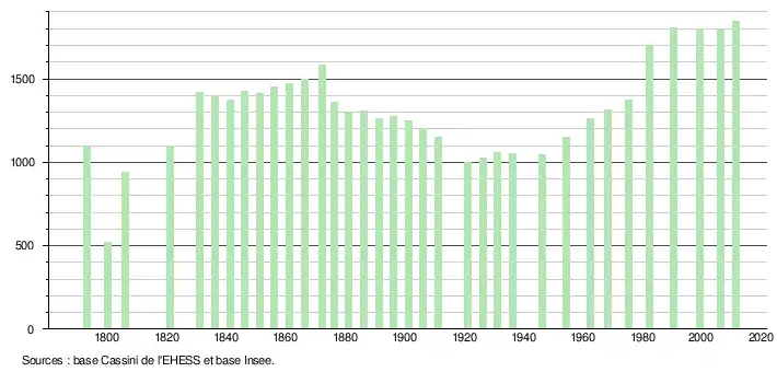 L'évolution du nombre d'habitants est connue à travers les recensements de la population effectués dans la commune depuis 1793. À partir du , les populations légales des communes sont publiées annuellement dans le cadre d'un recensement qui repose désormais sur une collecte d'information annuelle, concernant successivement tous les territoires communaux au cours d'une période de cinq ans. Pour les communes de moins de 10 000 habitants, une enquête de recensement portant sur toute la population est réalisée tous les cinq ans, les populations légales des années intermédiaires étant quant à elles estimées par interpolation ou extrapolation[17]. Pour la commune, le premier recensement exhaustif entrant dans le cadre du nouveau dispositif a été réalisé en 2006[18],[Note 1].