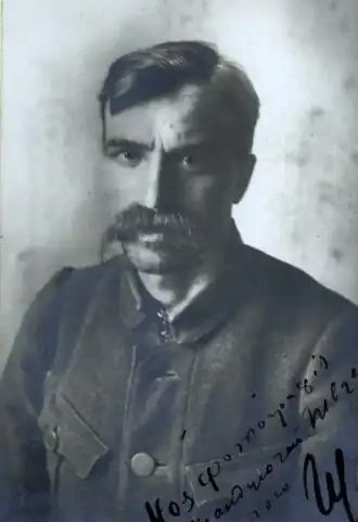 Gouvernement et commandement de l'armée de la RPU Yaltushkov, le 7 novembre 1920. De gauche à droite, 1er rang : Ivan Omelianovytch-Pavlenko, Symon Petlioura, Mikhaïlo Omelianovitch-Pavlenko, Gavrilo Bazilskyi, 2e : Andry Livytsky et Oleksandr Salikovskyi ; 3e : Yevhen Arkhipenko, ?, Oleksandr Oudovitchenko, Oleksii Galkin, Oleksandr Zagrodskyi, Pinkhas Krasnyi, Marko Bezroutchko, Andrii Doloud, Petro Lipko, Andriï Houly-Houlenko, Serhiï Timochenko.
