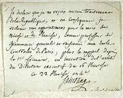 « Je déclare que je ne reçois aucun traitement de la République, et en conséquence je réclame mes appointemens pour le mois de Nivose et de Pluviose, comme professeur de grammaire générale et raisonnée aux Écoles Centrales de Paris ; plus le rappel depuis le 1er frimaire, en execution de l'arrêté du Directoire exécutif du 16 Pluviose. Le 22 Pluviose an 4e. »