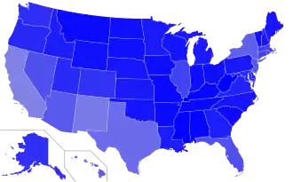 Proportion des locuteurs anglophones aux États-Unis d'après le recensement de 2000 et diverses sources. Le bleu foncé indique les plus hautes proportions.