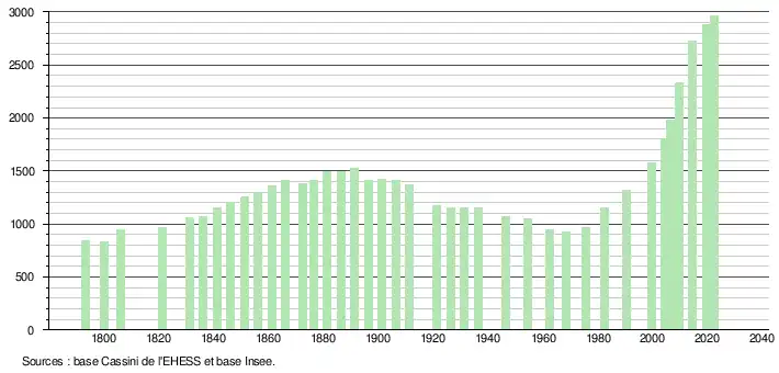 L'évolution du nombre d'habitants est connue à travers les recensements de la population effectués dans la commune depuis 1793. Pour les communes de moins de 10 000 habitants, une enquête de recensement portant sur toute la population est réalisée tous les cinq ans, les populations de référence des années intermédiaires étant quant à elles estimées par interpolation ou extrapolation[30]. Pour la commune, le premier recensement exhaustif entrant dans le cadre du nouveau dispositif a été réalisé en 2004[31].