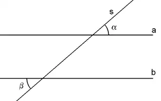 Sur la figure suivante, les droites a et b sont parallèles, s est une sécante quelconque.
