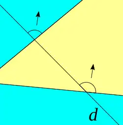 - ↑ Dans cette configuration, l'intérieur de la zone découpée par les deux droites est l'intersection des demi-plans dont les frontières sont les deux droites et contenant les deux sommets.