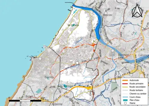Le plus grand bassin versant communal est celui du ruisseau d'Aritxague (huit kilomètres de long)[22] qui prend sa source dans le quartier de la Négresse à Biarritz, (au sud de l'aéroport) et qui va désormais se jeter dans l'Adour à l'est, en passant par le lac Brindos (lac naturel), longeant le quartier Maignon, se découpant un passage entre les deux plateaux des deux anciens peuplements de la commune (Brindos, au nord de la rivière et Sutar/Hondritz, au sud), obliquant au nord par le canal d'Atchinetche, qui traverse la zone BAB2 et du Forum, et va se jeter dans l'Adour, au niveau du Pont de l'Aveugle. Exclusivement urbain, son état écologique est indiqué comme mauvais en 2015[23]. Des moulins étaient positionnés le long de ce ruisseau tel que le moulin de Brindos ou moulin d’Aritxague, (propriété des seigneurs de Saint Pée dès les années 1390 durant quatre siècles). Son nom, du basque aritz - aga, le lieu du chêne, indique la présence d’une chênaie[24].