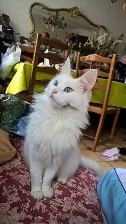 Il est à noter qu'à la naissance certain chat de pelage blanc présente une petite tache de couleur grise plus ou moins large au-dessus de la tête entre les deux oreilles. Cette tâche s'estompe au bout d'un an en même temps le poil se forme et prend du volume autour de la crinière, sous le ventre et sur la queue.