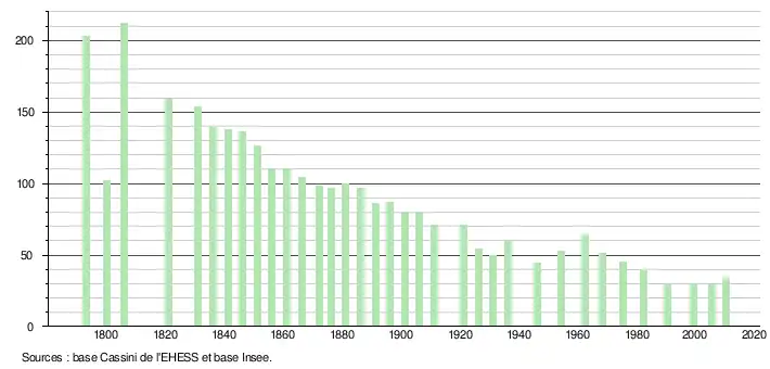 - ↑ Dans le tableau des recensements et le graphique, par convention dans Wikipédia, le principe a été retenu, pour les populations légales postérieures à 1999 de n’afficher dans le tableau des recensements et le graphique que les populations correspondant à l'année 2006, première population légale publiée calculée conformément aux concepts définis dans le décret no 2003-485 du 5 juin 2003, et les années correspondant à une enquête exhaustive de recensement pour les communes de moins de 10 000 habitants, ainsi que la dernière population légale publiée par l’Insee.