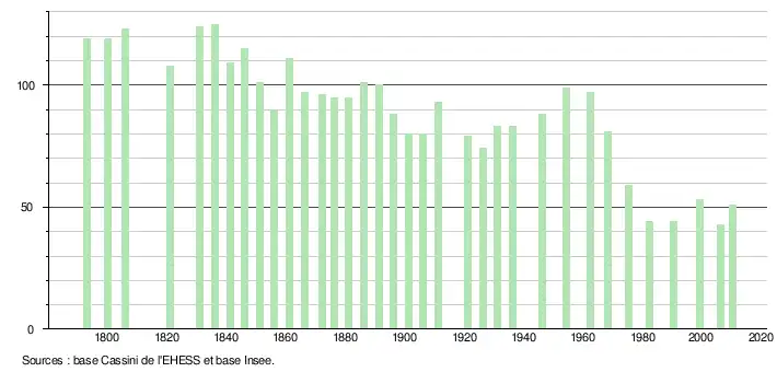 - ↑ Dans le tableau des recensements et le graphique, par convention dans Wikipédia, le principe a été retenu, pour les populations légales postérieures à 1999 de n’afficher dans le tableau des recensements et le graphique que les populations correspondant à l'année 2006, première population légale publiée calculée conformément aux concepts définis dans le décret no 2003-485 du 5 juin 2003, et les années correspondant à une enquête exhaustive de recensement pour les communes de moins de 10 000 habitants, ainsi que la dernière population légale publiée par l’Insee.