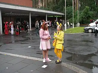 Deux jeunes femmes se déguisant en personnages d’anime à l’extérieur de l’Université de Jyväskylä lors d’Animecon 2007.