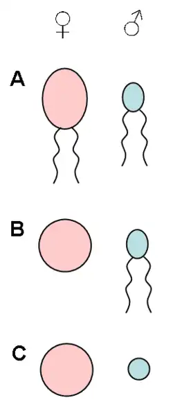 D'une manière générale, les gamètes femelles sont plus volumineux, plus riches en réserves, moins mobiles et moins abondants que les gamètes mâles. Ces différences sont considérées comme étant à l'origine de la sélection sexuelle, celle-ci étant à son tour responsable des caractères sexuels secondaires ou dimorphisme sexuel.