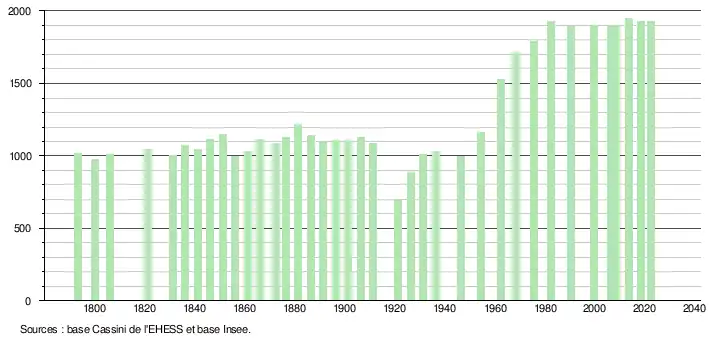 L'évolution du nombre d'habitants est connue à travers les recensements de la population effectués dans la commune depuis 1793. Pour les communes de moins de 10 000 habitants, une enquête de recensement portant sur toute la population est réalisée tous les cinq ans, les populations de référence des années intermédiaires étant quant à elles estimées par interpolation ou extrapolation[19]. Pour la commune, le premier recensement exhaustif entrant dans le cadre du nouveau dispositif a été réalisé en 2008[20].
