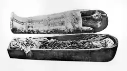 - Amenhotep Ier et son maître d’œuvre Inéni agrandissent le temple d’Amon à Karnak. Amenhotep Ier fait construire par Inéni le premier tombeau de la Vallée des rois sur la montagne de Thèbes[5]. Sa momie, retrouvée en 1881 dans la cache royale de Deir el-Bahari, est entièrement revêtu de toile orange et d’un masque de bois et de carton peint, et couverte de guirlandes de fleurs bleues, jaunes et rouges.