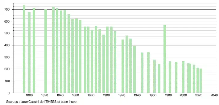 L'évolution du nombre d'habitants est connue à travers les recensements de la population effectués dans la commune depuis 1793. Pour les communes de moins de 10 000 habitants, une enquête de recensement portant sur toute la population est réalisée tous les cinq ans, les populations de référence des années intermédiaires étant quant à elles estimées par interpolation ou extrapolation[14]. Pour la commune, le premier recensement exhaustif entrant dans le cadre du nouveau dispositif a été réalisé en 2008[15].