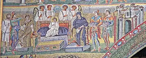 - ↑ Sur cette mosaïque du Ve siècle, Jésus, assis sur un coussin comme un roi d'Orient, est entouré de Marie et d'une femme voilée de noir que les chercheurs interprètent comme sainte Anne ou un symbole de la synagogue.