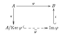 Soit φ un morphisme d'anneaux d'un anneau A vers un anneau B nul sur I. Il existe un isomorphisme unique entre les anneaux A / Ker φ et Im φ qui fait commuter le diagramme ci-dessous :
