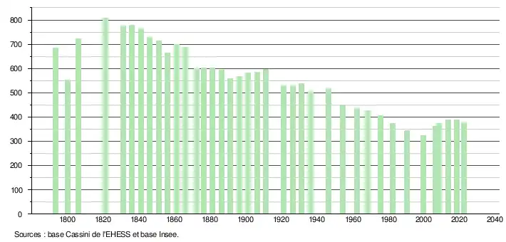 L'évolution du nombre d'habitants est connue à travers les recensements de la population effectués dans la commune depuis 1793. Pour les communes de moins de 10 000 habitants, une enquête de recensement portant sur toute la population est réalisée tous les cinq ans, les populations de référence des années intermédiaires étant quant à elles estimées par interpolation ou extrapolation[35]. Pour la commune, le premier recensement exhaustif entrant dans le cadre du nouveau dispositif a été réalisé en 2008[36].