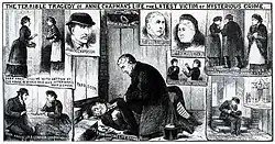 - ↑ Le tueur est également qualifié de "goule", de "Caïn fou", de "mi-homme, mi-bête", ou encore de "nouveau Williams" (en référence à Rhynwick Williams, qui agressait les femmes de Londres à la fin du XVIIIe s., et était surnommé le "Monstre de Londres"), de Jeckyll et Hyde. Le Times du 10 septembre, s'étonnant de l'audace du criminelle, et de sa passion morbide pour la boucherie humaine, évoque Le double assassinat de la rue Morgue d'Edgar Poe, ou encore l'œuvre de Thomas de Quincey. Cette série de meurtres semble unique dans les annales du crime, et plonge les observateurs dans l'incompréhension.