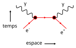 - (en) Cet article est partiellement ou en totalité issu de l’article de Wikipédia en anglais intitulé « Electron–positron annihilation » (voir la liste des auteurs).
