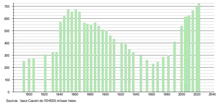 L'évolution du nombre d'habitants est connue à travers les recensements de la population effectués dans la commune depuis 1793. Pour les communes de moins de 10 000 habitants, une enquête de recensement portant sur toute la population est réalisée tous les cinq ans, les populations de référence des années intermédiaires étant quant à elles estimées par interpolation ou extrapolation[18]. Pour la commune, le premier recensement exhaustif entrant dans le cadre du nouveau dispositif a été réalisé en 2004[19].