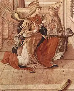 La scène se déroule avec une vue en perspective vertigineuse de la rue à gauche, se terminant par une arche ; cette construction spatiale s'inspire d'une composition peinte trente ans plus tôt par Andrea Mantegna dans la chapelle Ovetari de Padoue (le martyre de Saint-Christophe )[4]. À travers un trou dans le mur, un rayon divin accompagne le vol de la colombe du Saint-Esprit, qui atteint Marie humblement agenouillée devant le lutrin sur lequel elle consultait les Évangiles. La chambre de la Vierge est représentée avec une attention portée aux détails, y compris à des éléments symboliques qui sont tombés dans la vie quotidienne, tels que le lit soigneusement fait, signe d'une vie chaste et virginale, ou l'extraordinaire nature morte d'objets au-dessus de l'étagère, comprenant une bouteille en verre, symbole de la Pureté, ou une bougie allumée, symbole de la Foi. Une fenêtre avec une grille, réalisée avec une maîtrise totale de la perspective, contient un petit arbre dans un vase, allusion à l'inévitable hortus conclusus, et exprime la communication idéale entre l'ange et Marie. L'artiste a porté une grande attention au rendu des matériaux les plus disparates, du bois au tissu, des joyaux brillants de la robe et de la mitre de l'évêque à l'opacité de la terre cuite ou du tapis étalé sur le bord de la loggia du palais de Marie (un bâtiment élaboré et pleinement Renaissance), où il y a aussi un paon, autre symbole christologique d'immortalité[5]. À côté de cette fidélité optique, il y a un véritable triomphe décoratif, donné par la richesse des bas-reliefs dorés qui ornent le bâtiment et ceux voisins. Tout cela est encore renforcé par la lumière dorée qui imprègne toute la scène.