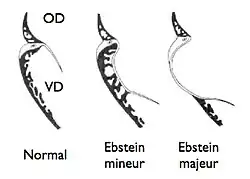 La maladie d'Ebstein est la conséquence d'un défaut plus ou moins complet de ce clivage, qui n'atteint pas l'anneau. Le développement de perforations qui donnent lieu normalement à la formation des cordages et muscles papillaires est incomplet ou absent, d'où le caractère redondant de la valve.