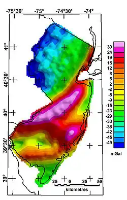 Cet écart (anomalie de gravité) peut être très significatif, de l'ordre de -300 à + 300 milligals, soit de -3 à + 3 mm/s2) et peut être cartographié.