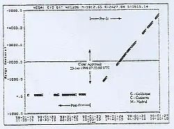 - L'excès de retard proportionnel à la portée du signal de télémesure révélé par les données de distance du réseau de surveillance spatiale des États-Unis lors du survol de NEAR[18]. Ce retard, qui tient compte de l'anomalie dans les données Doppler et de distance, ainsi que des oscillations Doppler restantes, à 10-20% près, indique des modes de modulation de fréquence en réception dus au taux Doppler, prédisant une anomalie positive uniquement lorsque le suivi par DSN est interrompu autour du périgée, et une anomalie nulle ou négative si le suivi est effectué en continu. Aucune anomalie ne devrait survenir en Doppler suivi par des stations non DSN[19].