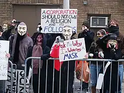 Membres d'Anonymous, New York, à l'occupation de Wall Street. L'affiche dit : « Les corrompus nous craignent . Les honnêtes nous soutiennent Les héros nous rejoignent »