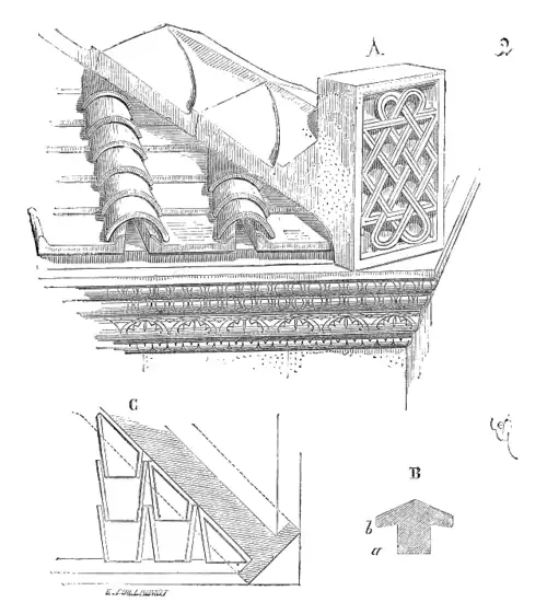 Une antéfixe dessinée par Viollet-le-Duc. A : une antéfixe dans l'angle d'une corniche. B : le profil de l'arêtier. C : son plan, avec la position des tuiles-canal à rebords.