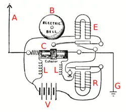 Le physicien russe Popov entreprit en 1894 la conception d'un récepteur longue-portée pouvant servir de détecteur de foudre, en enregistrant les impulsions électromagnétiques des éclairs[1]. Il adapta le cohéreur de Lodge de façon à réinitialiser le circuit après chaque réception de signal[2],[1] mais, pour améliorer la sensibilité du récepteur, il y raccorda le fil d'un paratonnerre : c'était l'acte de naissance de l'antenne filaire (A sur le schéma), antenne tendue dans l'air jusqu'à la terre (G)[1]. Comme Lodge et Hertz n'utilisaient que de petites antennes dipolaires ou une antenne boucle, on attribue à Popov l’invention de l’antenne long-fil[1].