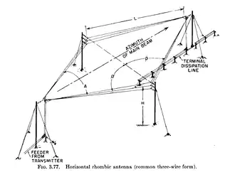 L’antenne rhombique qui en France est désignée antenne losange est un parallélogramme, l’antenne rhombique est à rayonnement radioélectrique directionnelle, inventée par Edmond Bruce (en) et Harald Friis. L’antenne rhombique présente des caractéristiques d’impédance et de rayonnement constantes dans une large bande de plusieurs octaves, l’antenne est utilisable en émission et en réception des haute fréquence aux ultra haute fréquence avec une très large bande[1]. Mécaniquement simple à réaliser, elle est utilisée en télévision terrestre, en liaisons point à point, par des stations utilitaires HF et par les radioamateurs.