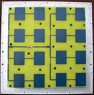 - Les panneaux rayonnants en hyperfréquence comportent de nombreuses antennes élémentaires, en général antenne patch (ou plane ou planaire), sur un support plan.