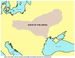 Le premier à mentionner les Antes fut Jordanès, fonctionnaire devenu écrivain qui vécut au VIe siècle et qui se proclame d’ascendance goth ou alane. Selon lui, les Antes étaient les descendants des anciens Venethi qu’il mentionne à côté des Sklavènes et des Antes. Ils vivaient entre le Dniestr et le Dniepr à proximité des Sklavènes dont le territoire s’étendait « de la ville de Noviodunum et du lac Mursianus au Danastr, et au nord aussi loin que la Vistule »[7]. Procope de Césarée (vers 500 – après 565) qui accompagna le général Bélisaire lors des guerres de Justinien Ier (r. 525 – 567) mentionne tout comme Jordanès qu’Antes et Sklavènes étaient voisins et avance, contrairement au premier, que dans les temps anciens ils s’appelaient Sporoi (Σπόροι)[8],[N 1]. Contrairement aussi à Jordanès il fait vivre les Antes immédiatement au-delà de la rive nord du Danube, c’est-à-dire en Valachie[9]. Toutefois, ce manque apparent de concordance pourrait simplement signifier que les Antes, loin d’être une entité regroupée sur un territoire restreint, étaient répandus dans une vaste région qui s’étendait sur une bonne partie de la Scythie sarmate[10],[N 2].