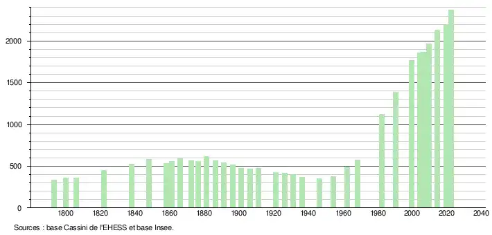 L'évolution du nombre d'habitants est connue à travers les recensements de la population effectués dans la commune depuis 1793. Pour les communes de moins de 10 000 habitants, une enquête de recensement portant sur toute la population est réalisée tous les cinq ans, les populations de référence des années intermédiaires étant quant à elles estimées par interpolation ou extrapolation[11]. Pour la commune, le premier recensement exhaustif entrant dans le cadre du nouveau dispositif a été réalisé en 2004[12].
