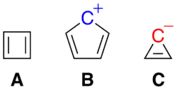 On compte par exemple parmi les composés anti-aromatiques le cyclobutadiène (A), le cation cyclopentadiényle (B) et l'anion cyclopropényle (C). Le cyclooctatétraène est un système à 4n électrons π mais n'est ni aromatique, ni anti-aromatique, car la molécule n'est pas plane.
