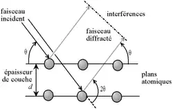 Expérimentalement, on peut mettre en évidence l'apparition de ce désordre magnétique (tendance des moments magnétiques à s'orienter aléatoirement) grâce à la diffraction de neutrons[13]. En effet, si les électrons peuvent diffracter selon la loi de Bragg grâce aux interactions électrostatiques des atomes dans les structures cristallines, on peut avoir une diffraction des neutrons par interaction des moments magnétiques, lorsqu'ils possèdent aussi un certain ordre. Ainsi, plus le matériau est ordonné, plus il comporte de plans de diffraction et donc un nombre de pics élevé en intensité en fonction de l'angle de diffraction. On rappelle qu'il y a diffraction lorsqu'on respecte les conditions de Bragg: ,