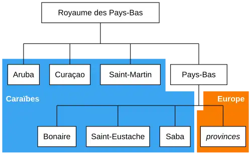 Le royaume des Pays-Bas est actuellement constitué de l'État des Pays-Bas, de l'État d'Aruba, de l'État de Curaçao, de l'État de Saint-Martin (Sint Maarten), ainsi que des communes à statut particulier de Bonaire, Saba et Saint-Eustache au sein de l'État des Pays-Bas.