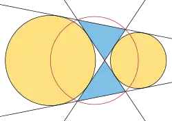 - Les côtés prolongés de l'antiparallélogramme sont les bitangentes de deux cercles[3].