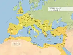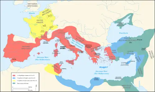 Dans l'ouest du monde méditerranéen, l'Italie passe au même moment sous le contrôle de la République romaine, qui étend ensuite sa domination sur toutes les rives de la Méditerranée, soumettant les royaumes hellénistiques, et s'imprégnant profondément de culture grecque. À la fin du Ier siècle, Rome devient une monarchie, l'empire romain, qui connaît son apogée au IIe siècle (la pax romana), avant de connaître une période d'instabilité interne et de menaces extérieures au IIIe siècle face à un nouvel empire perse à l'est et aux raids de peuples « barbares » sur sa frontière nord.
