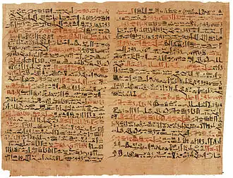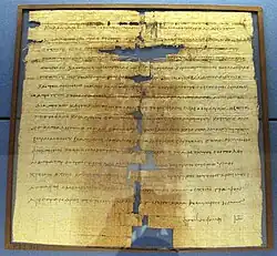 - des sources papyrologiques (textes écrits sur papyrus)[32],[33] : il s'agit d'une source importante pour la civilisation égyptienne antique, les conditions climatiques de ce pays permettant une bonne conservation de cette matière, et très variée ; le papyrus est également le matériau privilégié d'écriture dans le monde gréco-romain avant d'être supplanté par le manuscrit (après 500 apr. J.-C.) ;