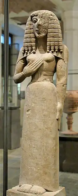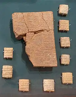 - des sources épigraphiques, des textes retrouvés sur des sites antiques[29],[30] : les inscriptions sur pierre retrouvées sur les sites antiques, qui constituent une source importante pour l'Antiquité gréco-romaine, mais qui sont également présentes dans les autres civilisations antiques ; les ostraca, écrits sur tessons de poteries ou éclats de calcaire, constituent une autre source écrite importante ; les textes sur tablettes d'argile, essentiellement les centaines de milliers de tablettes cunéiformes, qui couvrent une vaste gamme de sujets (gestion, administration, religion, sciences, littérature, éducation, correspondance officielle et privée, etc.) et constituent l'essentiel de la documentation écrite provenant des civilisations du Proche-Orient ancien[31] ;