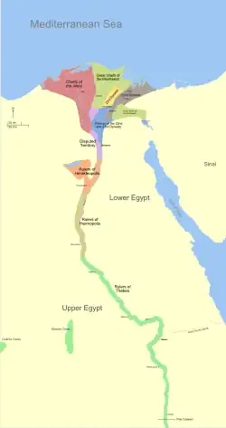La dynamique centralisatrice s'essouffle à la fin de la VIe dynastie, à laquelle succède la première Période intermédiaire (v. 2200-2030 av. J.-C.), qui comprend quatre dynasties, qui ont pu régner au même moment sur des parties différentes du pays. Le pays s'est en effet divisé politiquement, entre plusieurs centres de pouvoir (Memphis, Hérakléopolis, Thèbes). La période est mal documentée, mais les générations postérieures en ont retenu l'image d'un temps chaotique, marqué par des guerres et des famines, un traumatisme à ne plus reproduire. Les recherches modernes ont tempéré cette vision dramatique[57].