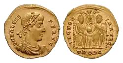 Avers : effigie de l’empereur Valens. Revers : Valens et Valentinien Ier en trône, tenant l'orbe ensemble.